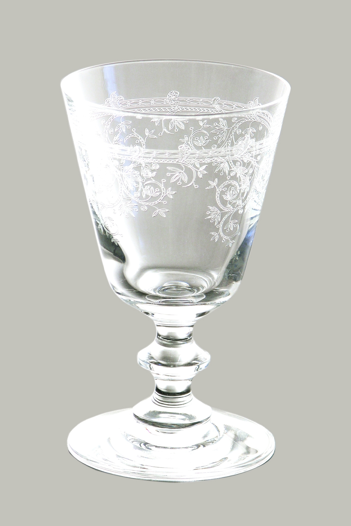 Finest crystal glass without lead and arsenic additives with classic pantography decor., To do this, the glass is previously covered with a wax coat and the decoration is then engraved into the wax coat.,